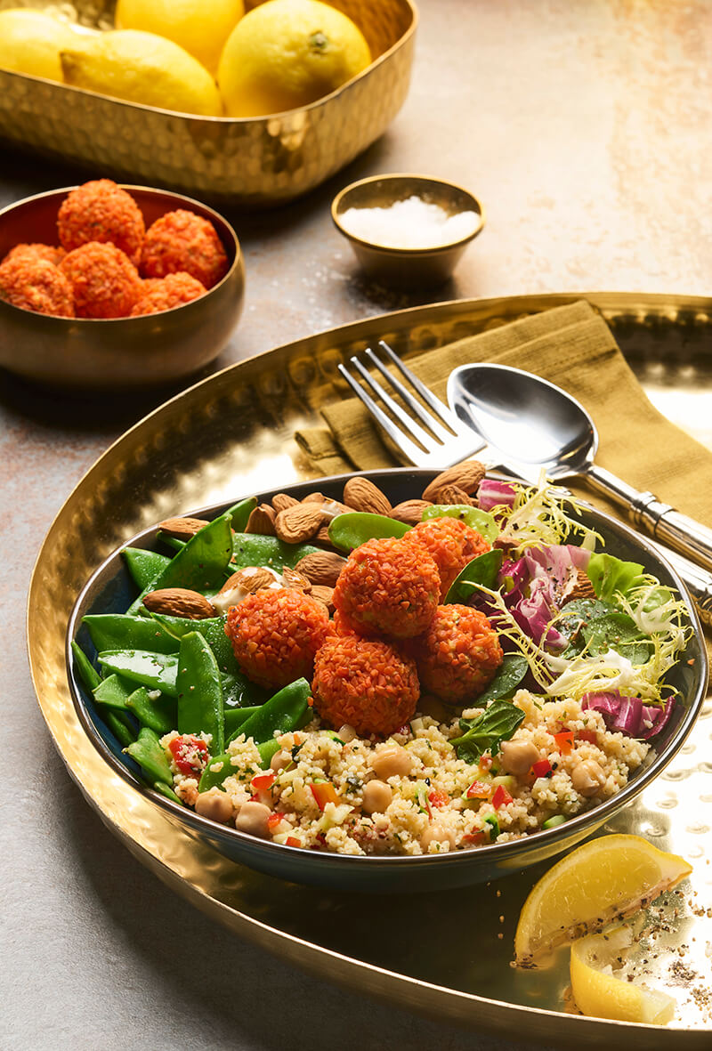 Besonders gut eignet sich die Frischkäsekugel als Highlight in einer orientalisch inspirierten Bowl. In Kombination mit unserem aromatischen Couscoussalat Tunis entsteht ein stimmiges Geschmackserlebnis: lockerer Couscous, feine Gewürze und frische Kräuter treffen auf die sanfte Cremigkeit der Frischkäsekugel – ideal für eine leichte, aber dennoch sättigende Mahlzeit.